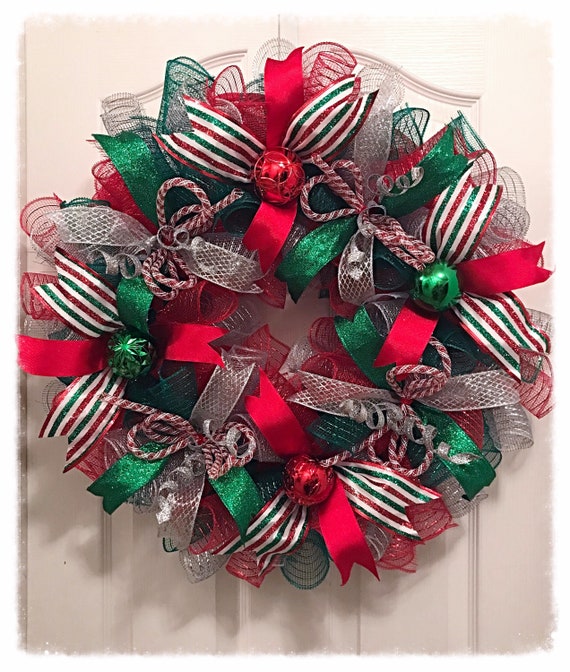 Red and green deco mesh christmas wreath clearance, Candy Striped Merry Christmas Deco Mesh Wreath/red Silver and - Etsy UK clearance