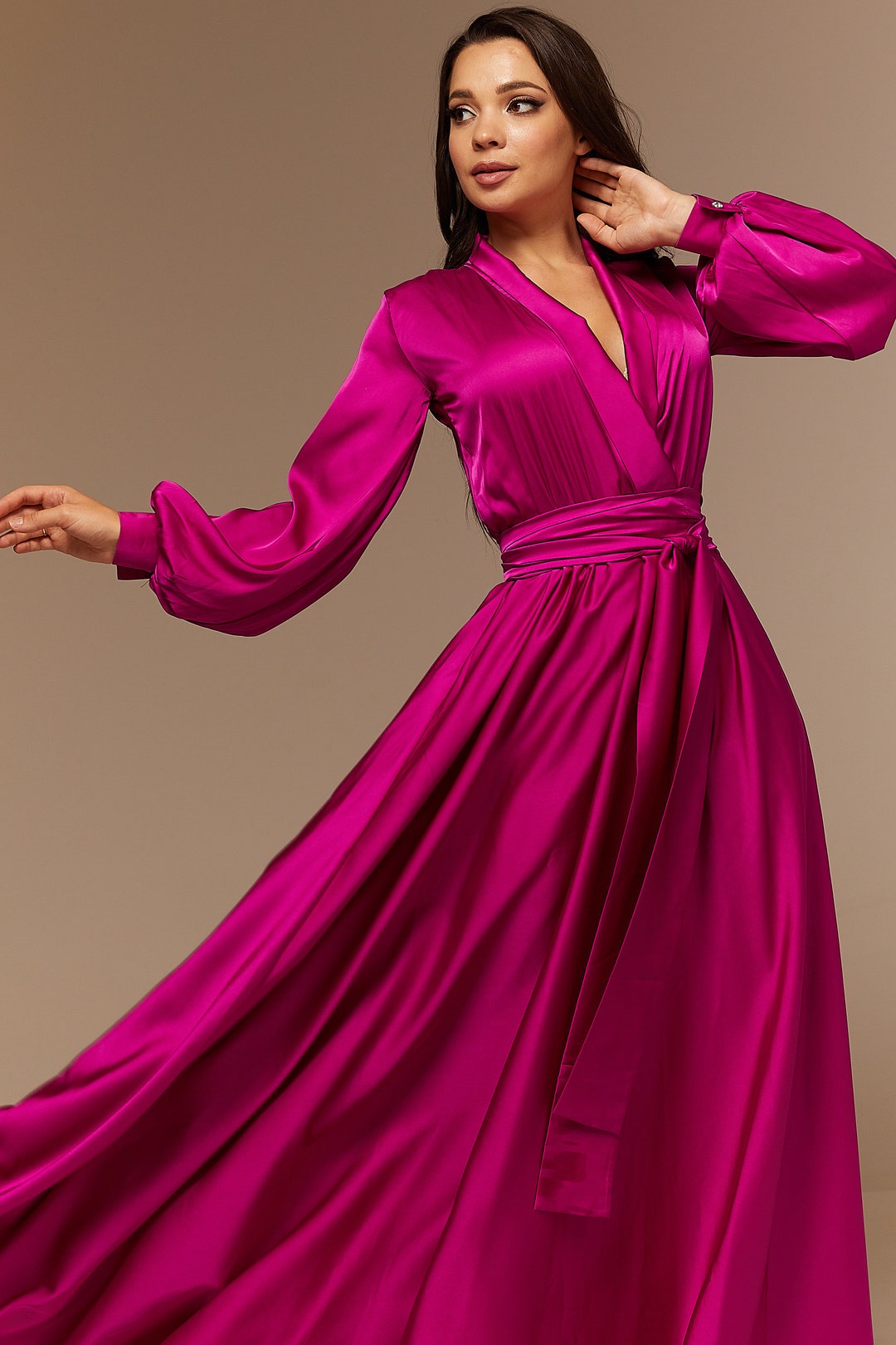 Magenta dress clearance, Fuchsia Silk Bridesmaid Dress Long Sleeve Magenta Satin Maxi - Etsy Norway clearance