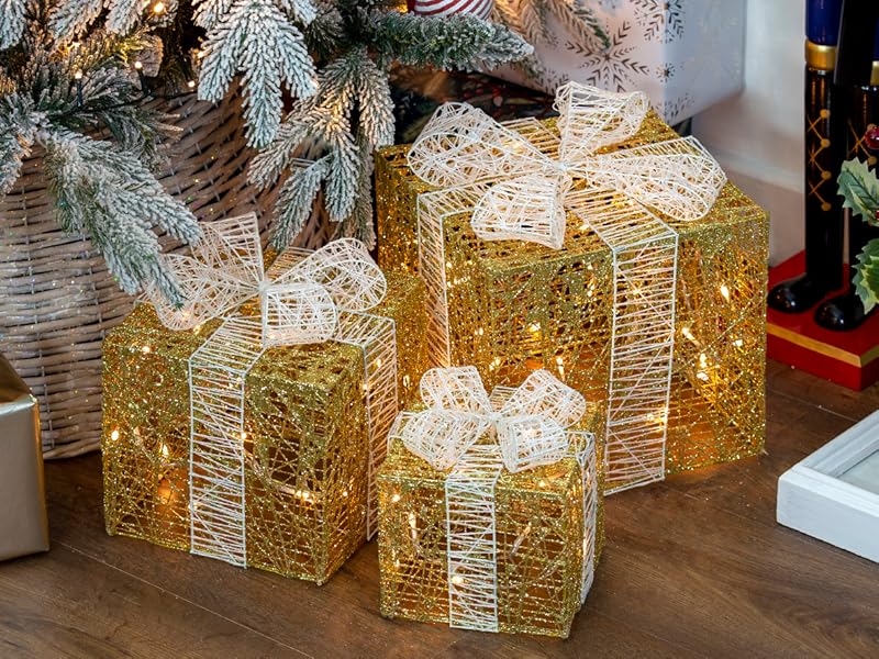 Gold christmas present lights clearance, The Christmas Workshop Set of 3 Light-Up Christmas Boxes | Indoor Christmas Decorations | LED Lights | Battery Operated (Gold and White, 65 LED's) : Amazon.co.uk: Lighting clearance