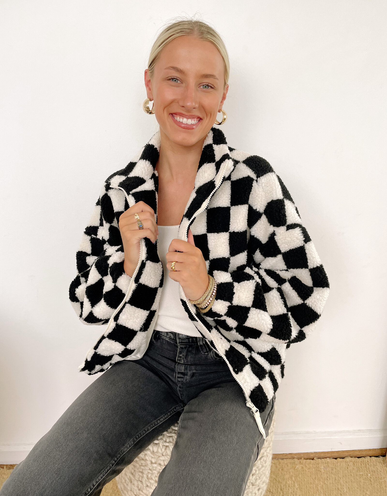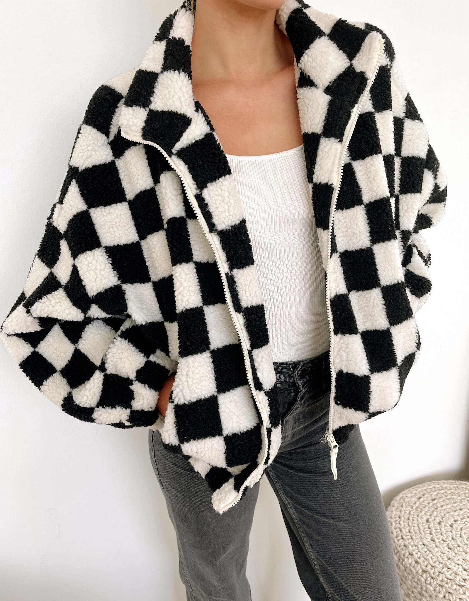 - Black and white checkered sherpa jacket