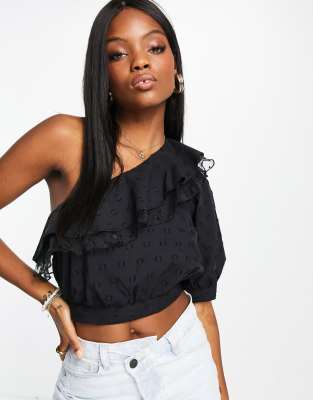 Ruffle trim asymmetrical shoulder top clearance, dobby asymmetric ruffle top in black clearance