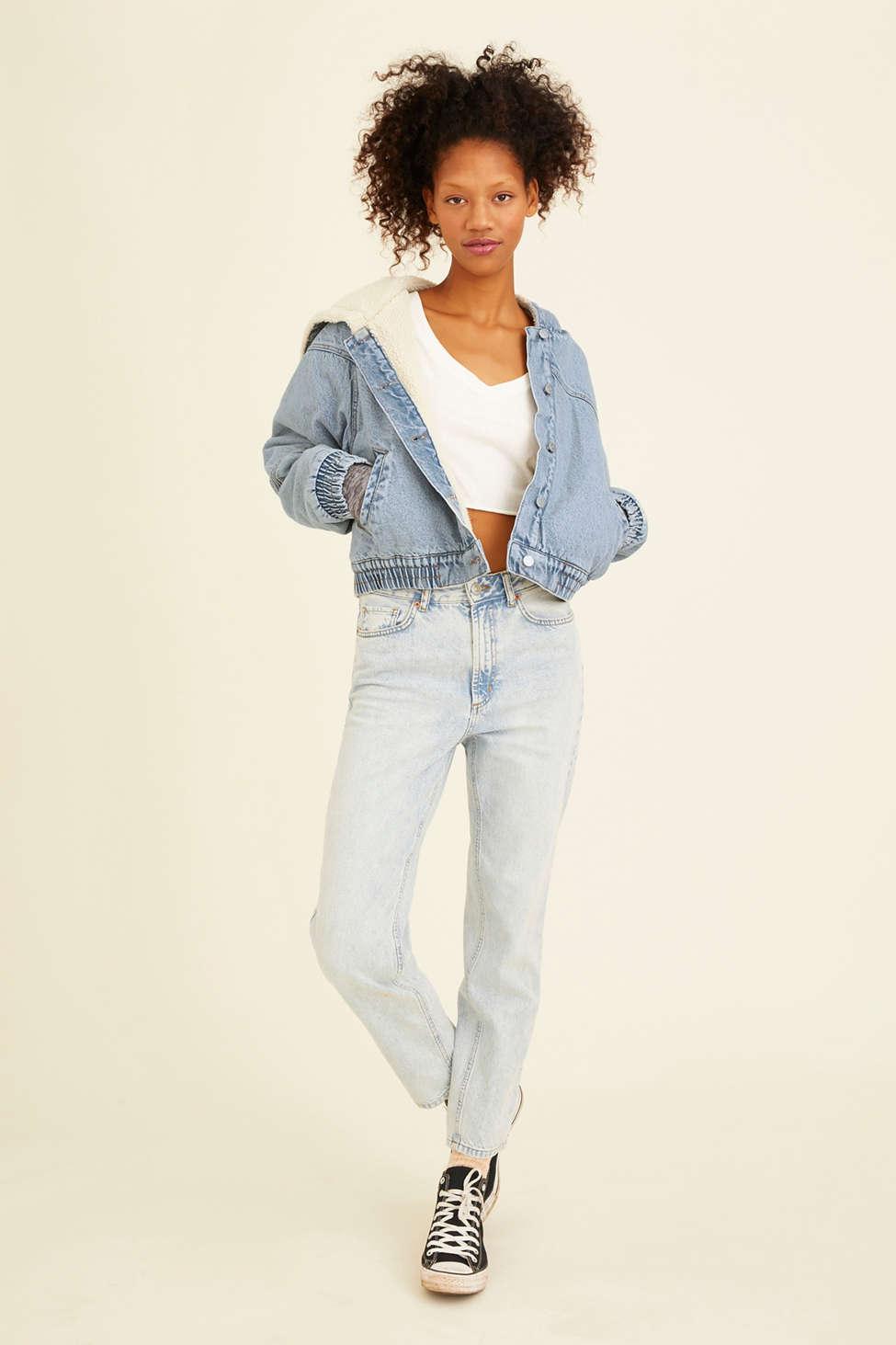 Denim hooded bomber jacket clearance, Uo Vintage Wash Borg Hooded Crop Denim clearance