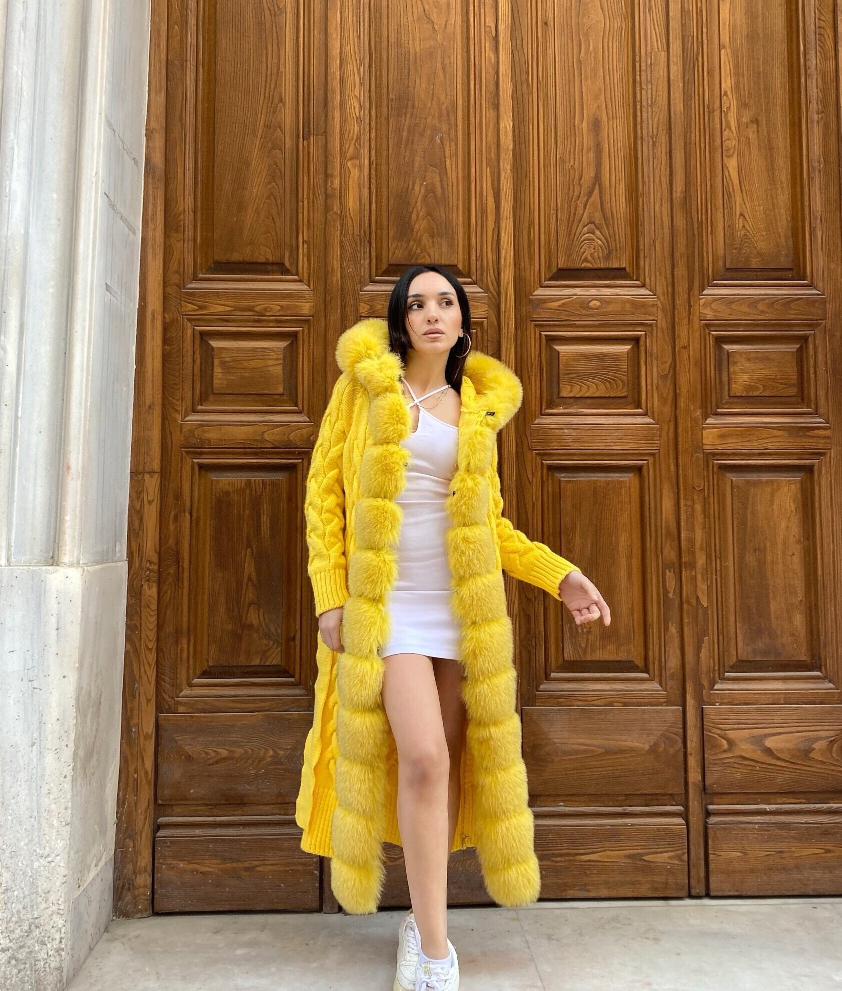 - Lemon yellow faux fur coat shop