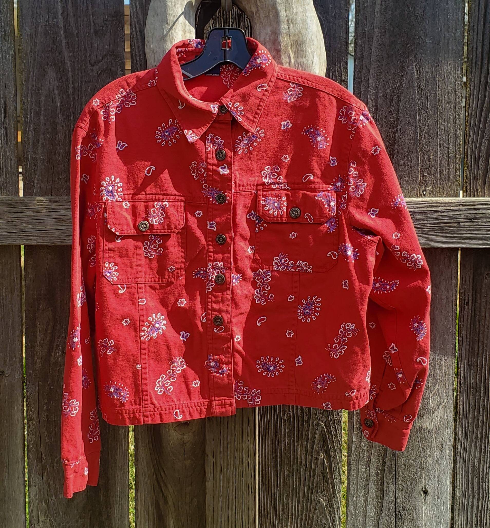 Red bandana jean jacket clearance, VNTG Boston Proper Western Paisley Denim Jacket - Etsy Canada clearance