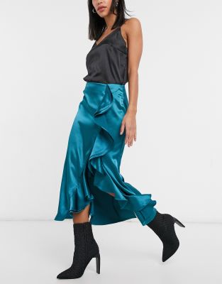 Teal satin skirt clearance, Label satin ruffle front midi skirt clearance