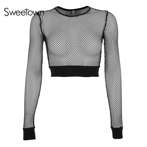 Mesh long sleeve t shirt clearance, Sweetown Harajuku Mesh Fishnet Crop Top clearance