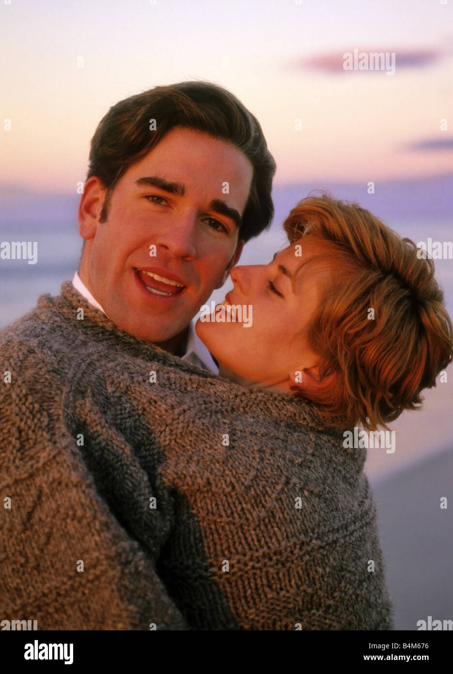 Couple in one sweater clearance, Couple wearing one sweater beach Stock clearance