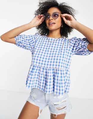 Gingham peplum top clearance, JDY puff sleeve peplum top in blue clearance