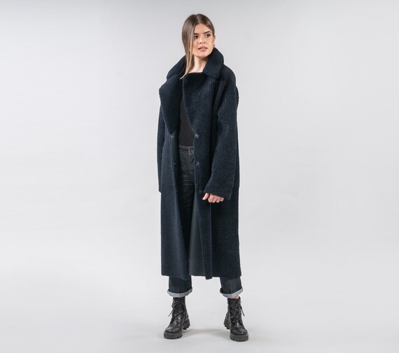 Navy sheepskin coat clearance, Reversible Navy Blue Shearling Coat clearance