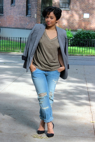- Army green shirt with blue jeans