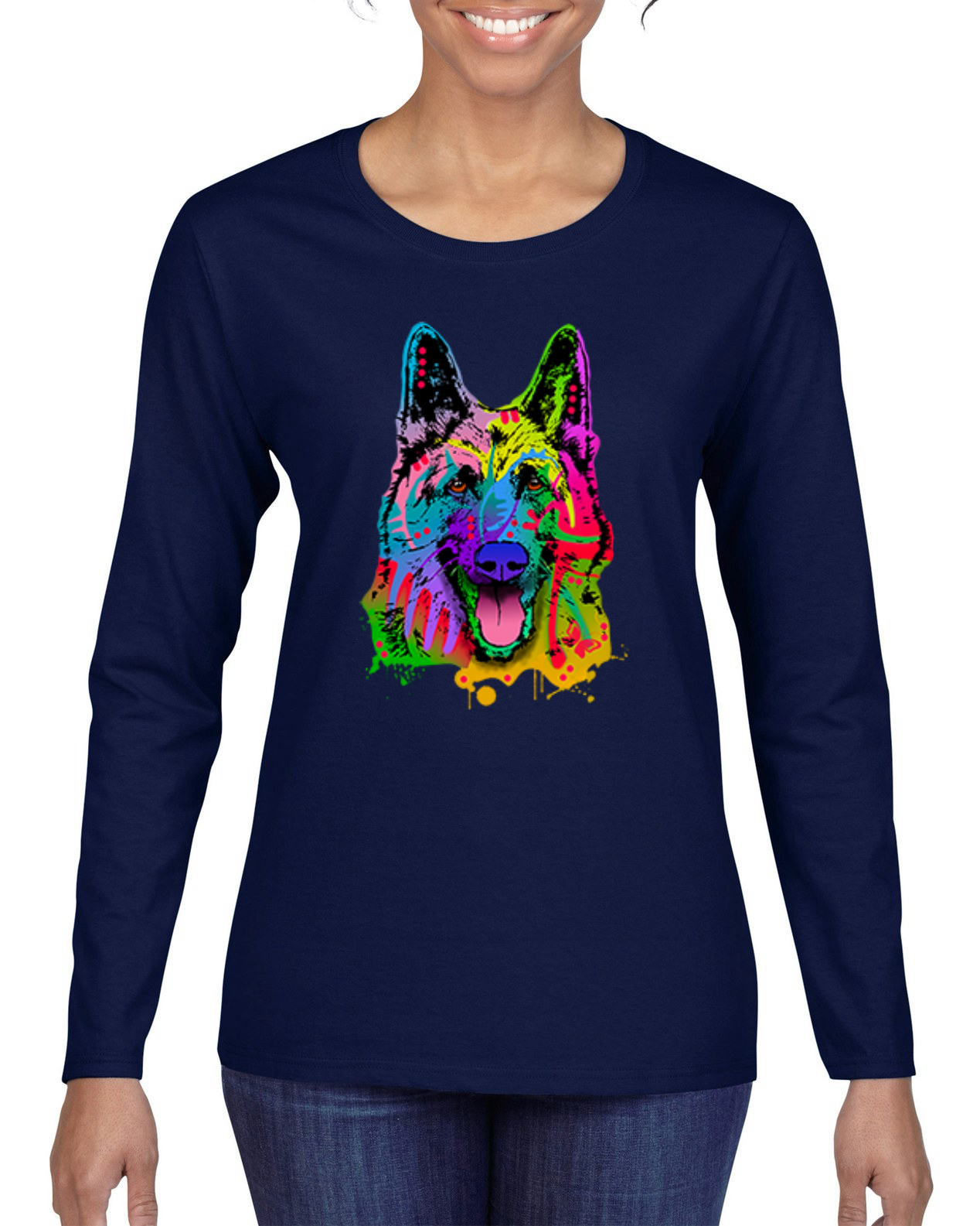 German shepherd long sleeve shirt clearance, Wild Bobby Colorful Happy German Shepherd Dog Animal Lover Womens Graphic Long Sleeve T-Shirt, Navy, 2XL, Women's, Blue clearance