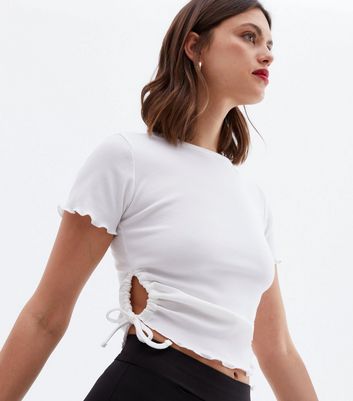 Shirt with sides cut out clearance, White Ribbed Ruched Cut Out Side Crop T clearance