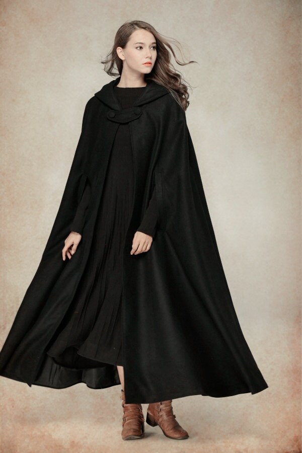 Black cape coat cloak clearance, Flare Wool Coat Jacket Black Hooded Cloak Winter Cape Black - Etsy clearance