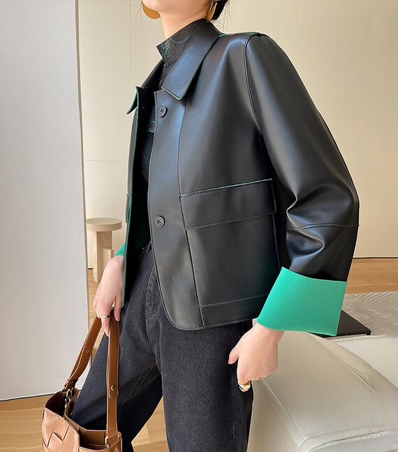 - Contrast faux leather jacket sale