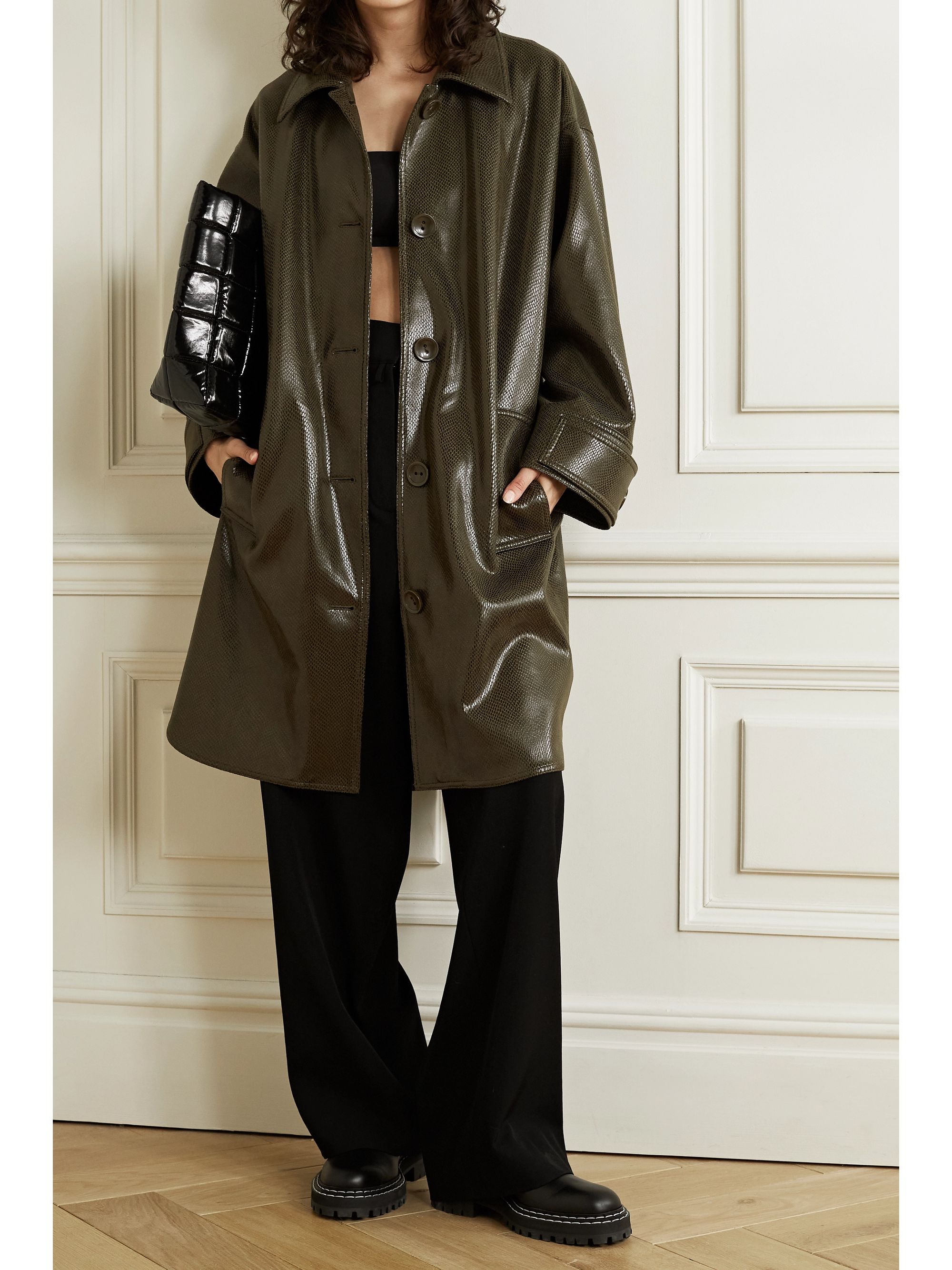 Green faux leather coat clearance, Dark green Kali oversized snake-effect clearance