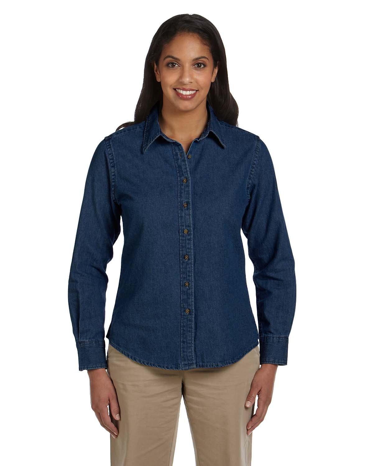Walmart womens denim shirt clearance, Harriton M550W Ladies' 6.5 oz. Long-Sleeve Denim Shirt 2XL Dark Denim clearance