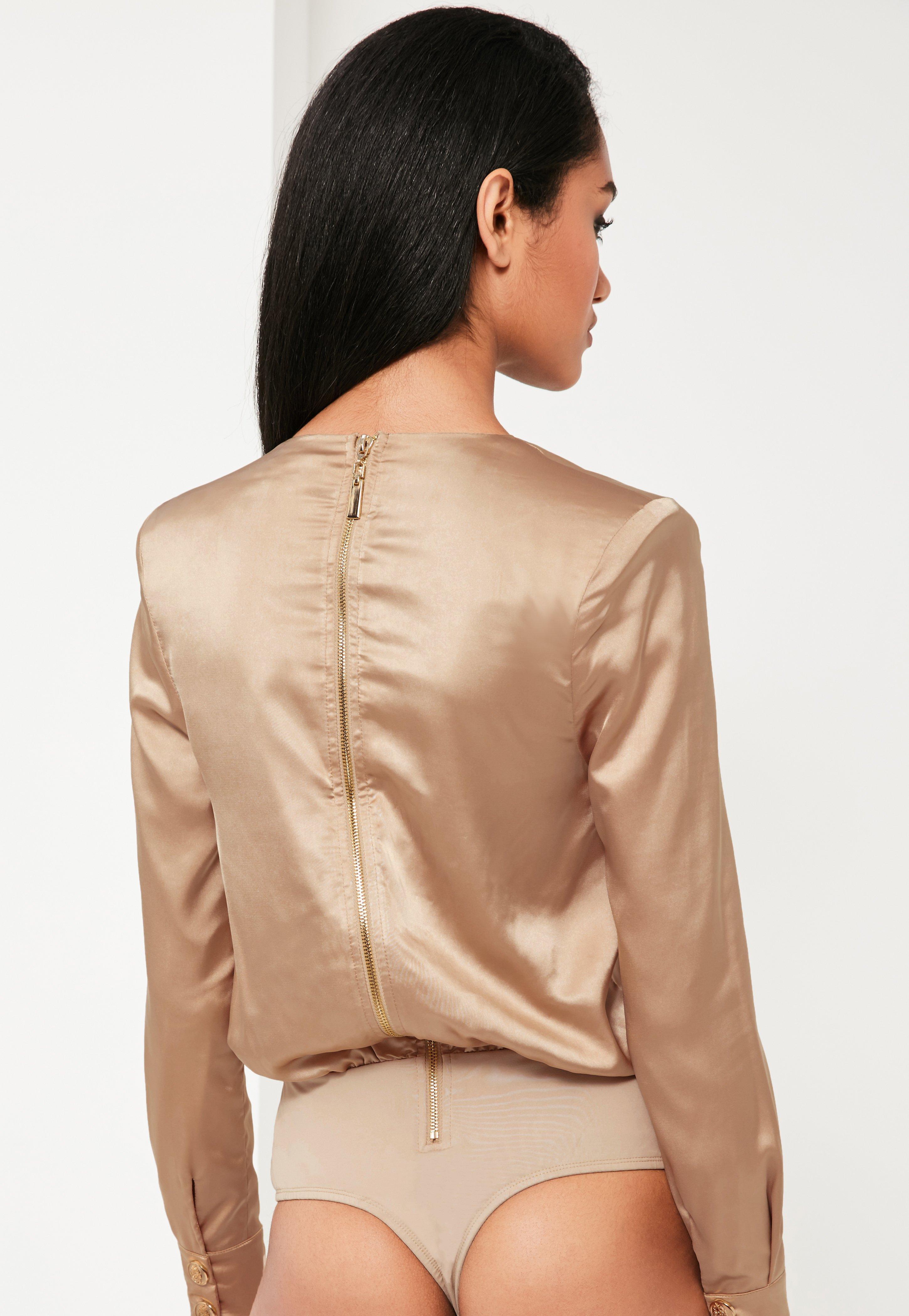 Satin bodysuit long sleeve clearance, Missguided Peace + Love Nude Satin Wrap clearance