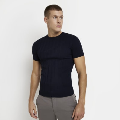 Muscle fit ribbed t shirt clearance, Dark Blue Chunky Ribbed Muscle Fit clearance