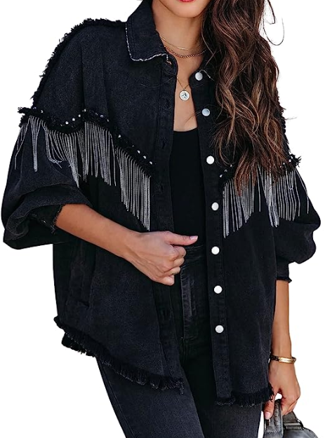 Black denim jacket with tassels clearance, Zeagoo Women's Fringe Jacket Button Down Long Sleeve Cropped Denim Jean Jacket with Pockets Black S at Amazon Women's Coats Shop clearance