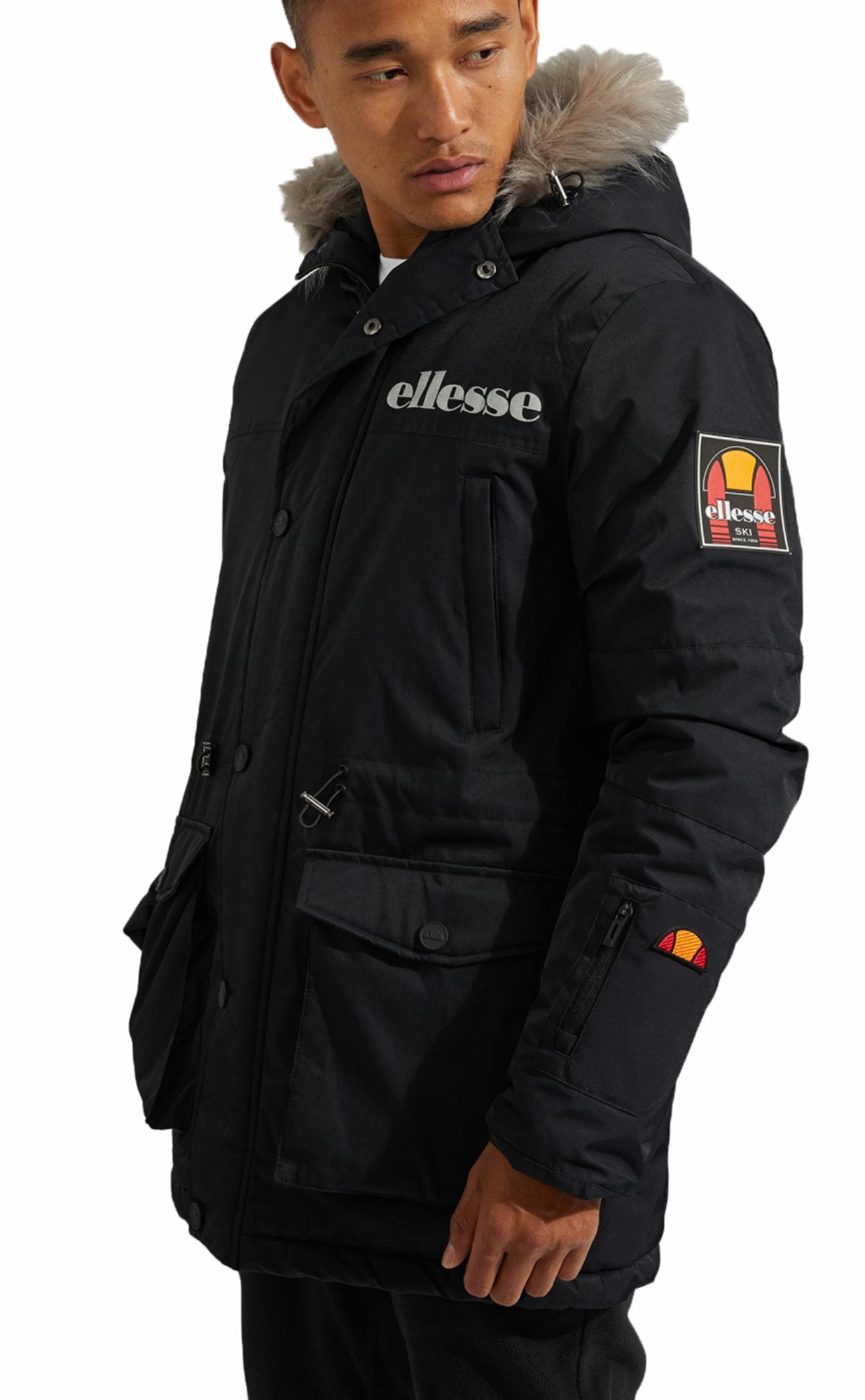 Ellesse parka jacket with faux fur hood in black clearance, Ellesse Parka Jacket With Faux Fur Hood clearance