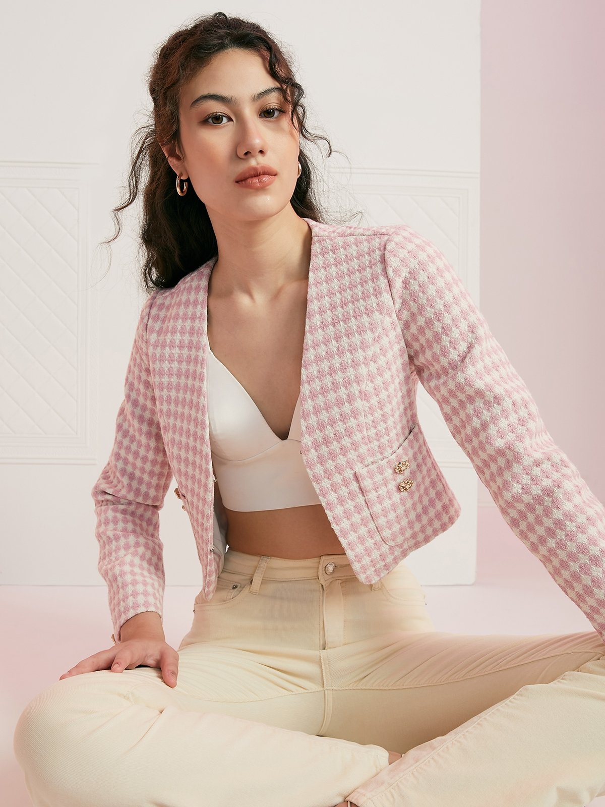 - Pink collarless blazer shop