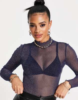 Long sleeve glitter mesh top clearance, NA-KD long sleeve high neck top in navy clearance