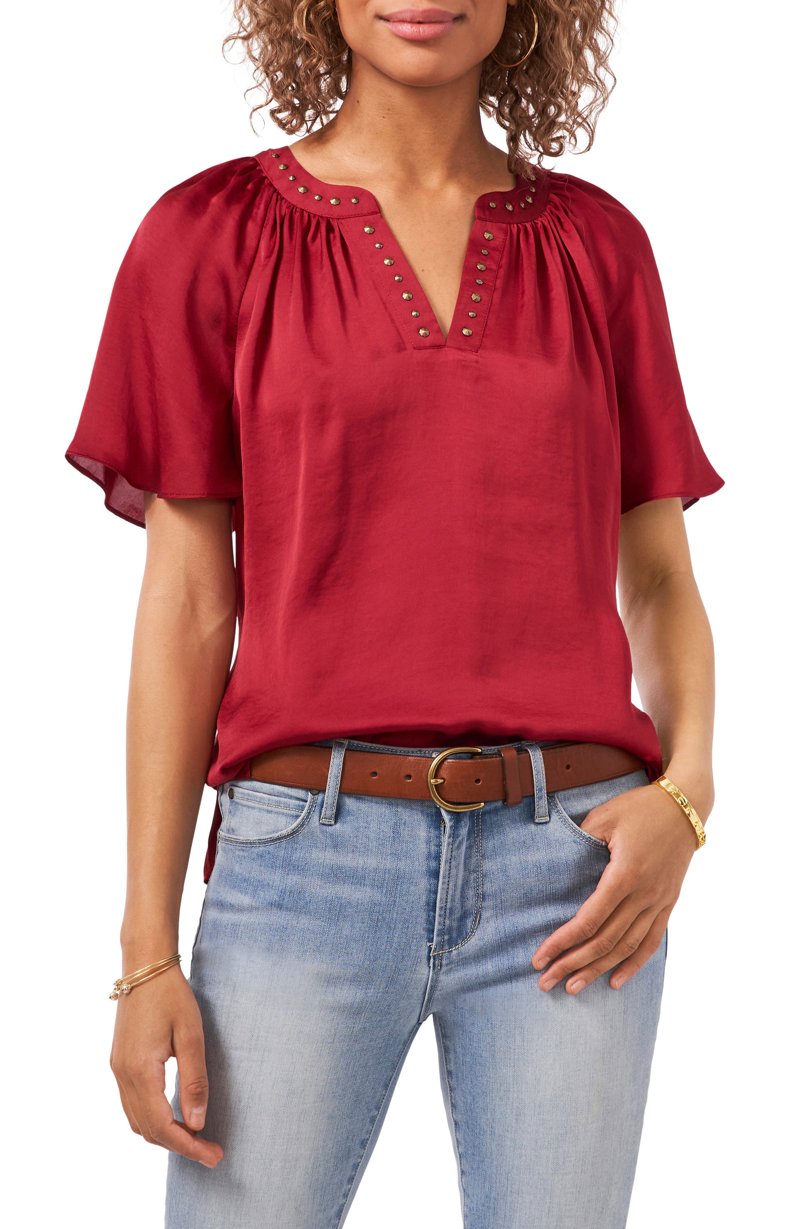 Woman in red blouse clearance