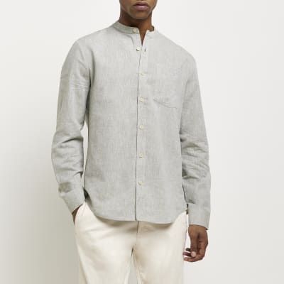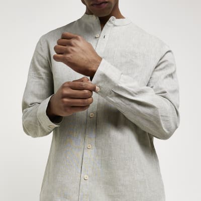 River island grandad shirt clearance, Green regular fit linen grandad collar clearance