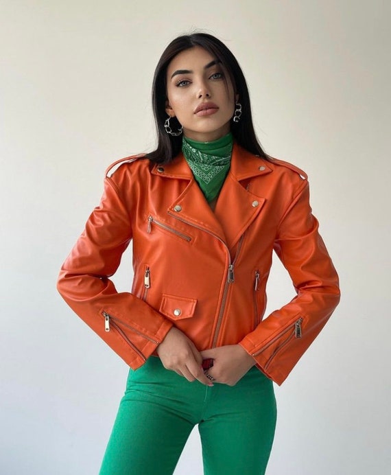 - Orange faux leather jacket shop