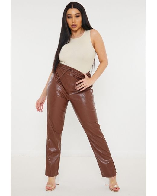 Faux leather brown trousers clearance, Nude Chocolate Mock Croc Split Hem clearance