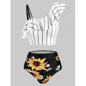 - Striped sunflower print one shoulder tummy control tankini swimwear sale