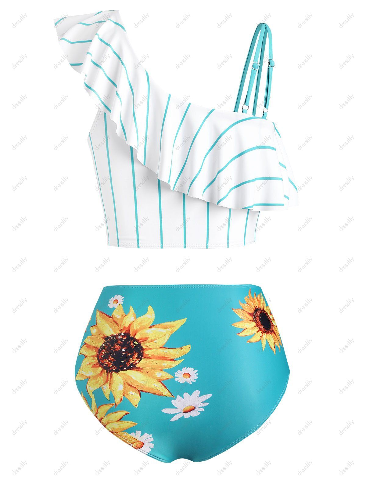 - Striped sunflower print one shoulder tummy control tankini swimwear free shipping