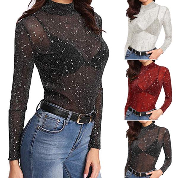 Sheer glitter long sleeve top clearance, Women Sequin See-Through Long Sleeve clearance