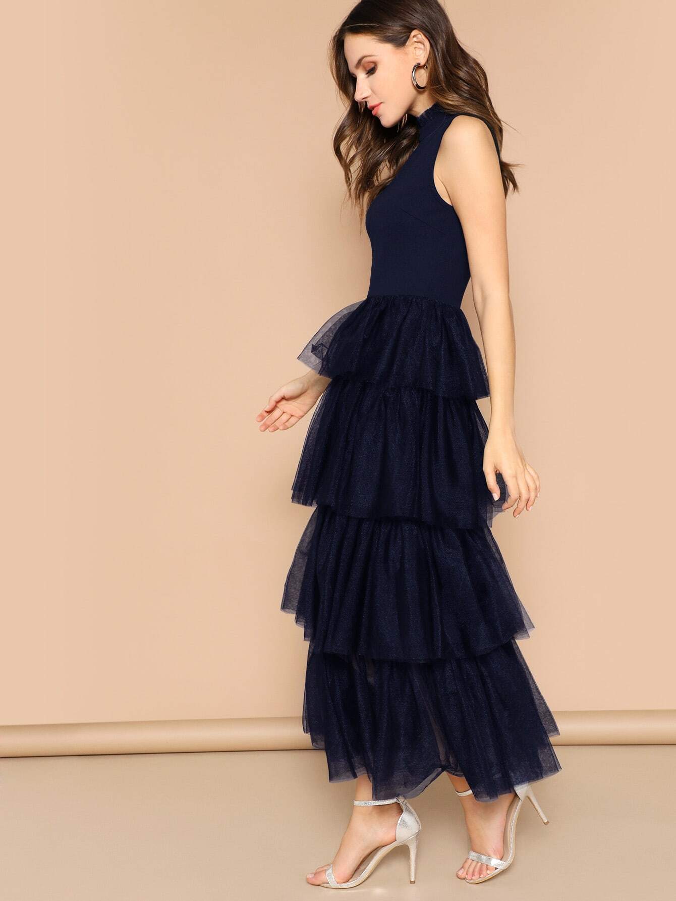 - Frilled neckline layered mesh ruffle hem dress shop