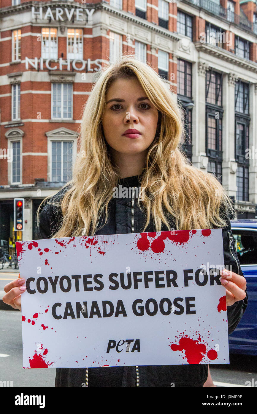 Wearing canada goose in london clearance, Wearing a replica Canada Goose jacket, a PETA model stands in a bloody steel trap at a protest in Knightsbridge, where department stores Harvey Nichols and Harrods sell Canada Goose outerwear. London, clearance