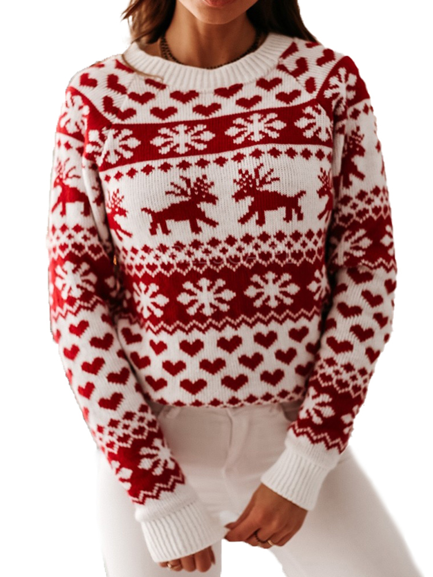 Reindeer print sweater clearance, Pybcvrrd Women's Christmas Elk Snowflake Print Sweater Knitted Pullover Round Neck Jumper, Size: Large, White clearance