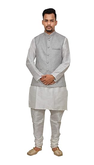 White kurta with grey waistcoat clearance, White Matching silk Kurta Churidhar clearance