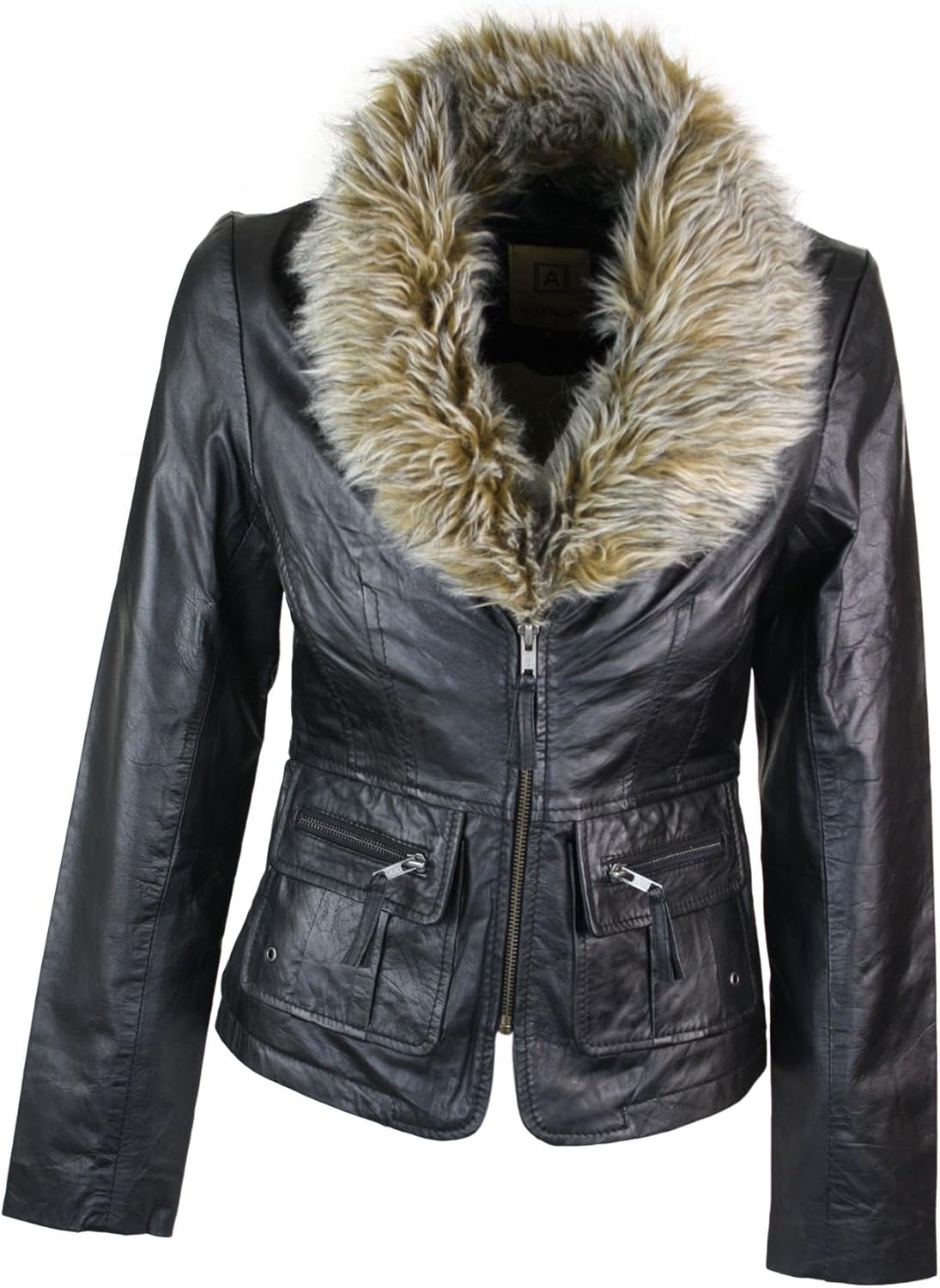 Short leather jacket with fur collar clearance, Ladies Real New Vintage Short Black clearance