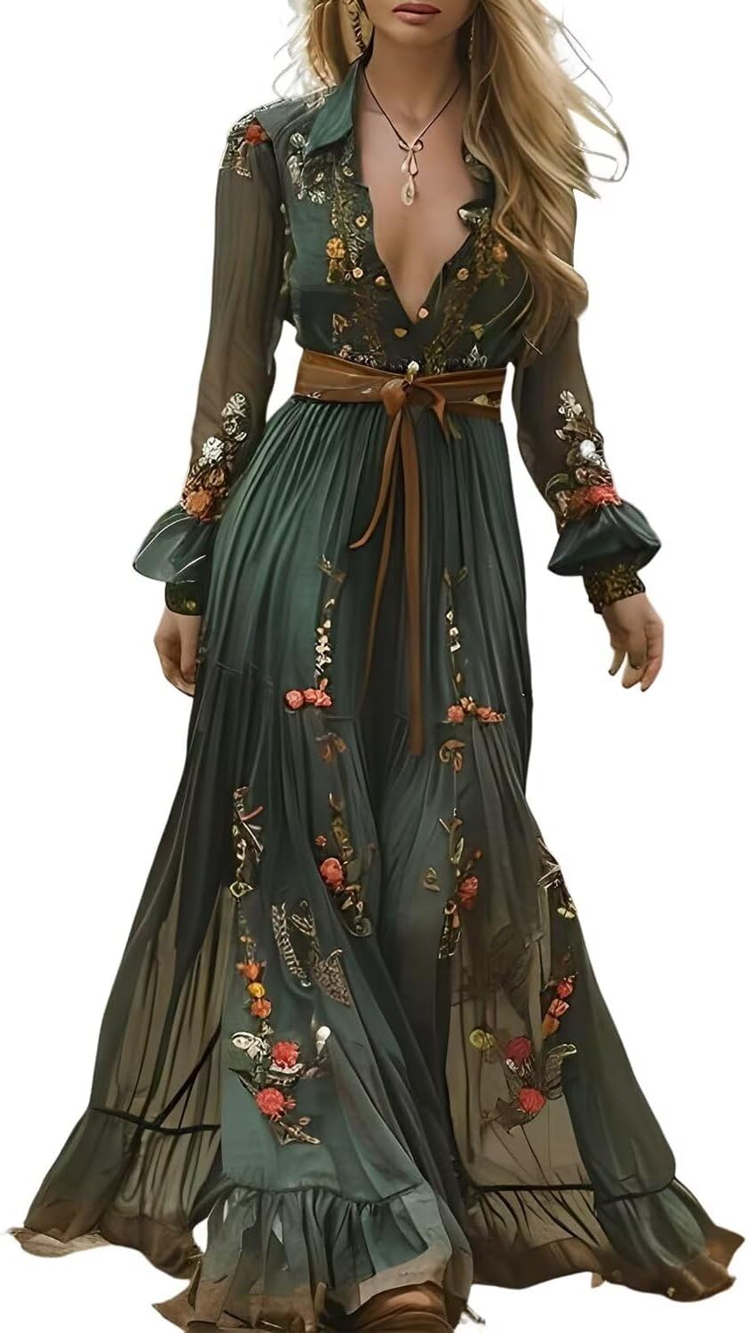Vintage style maxi dress clearance, Womens Sexy V-Neck Long Sleeve Flower Long Dress Vintage Western Country Maxi Chiffon Dress Fall Casual Flowy Dress clearance
