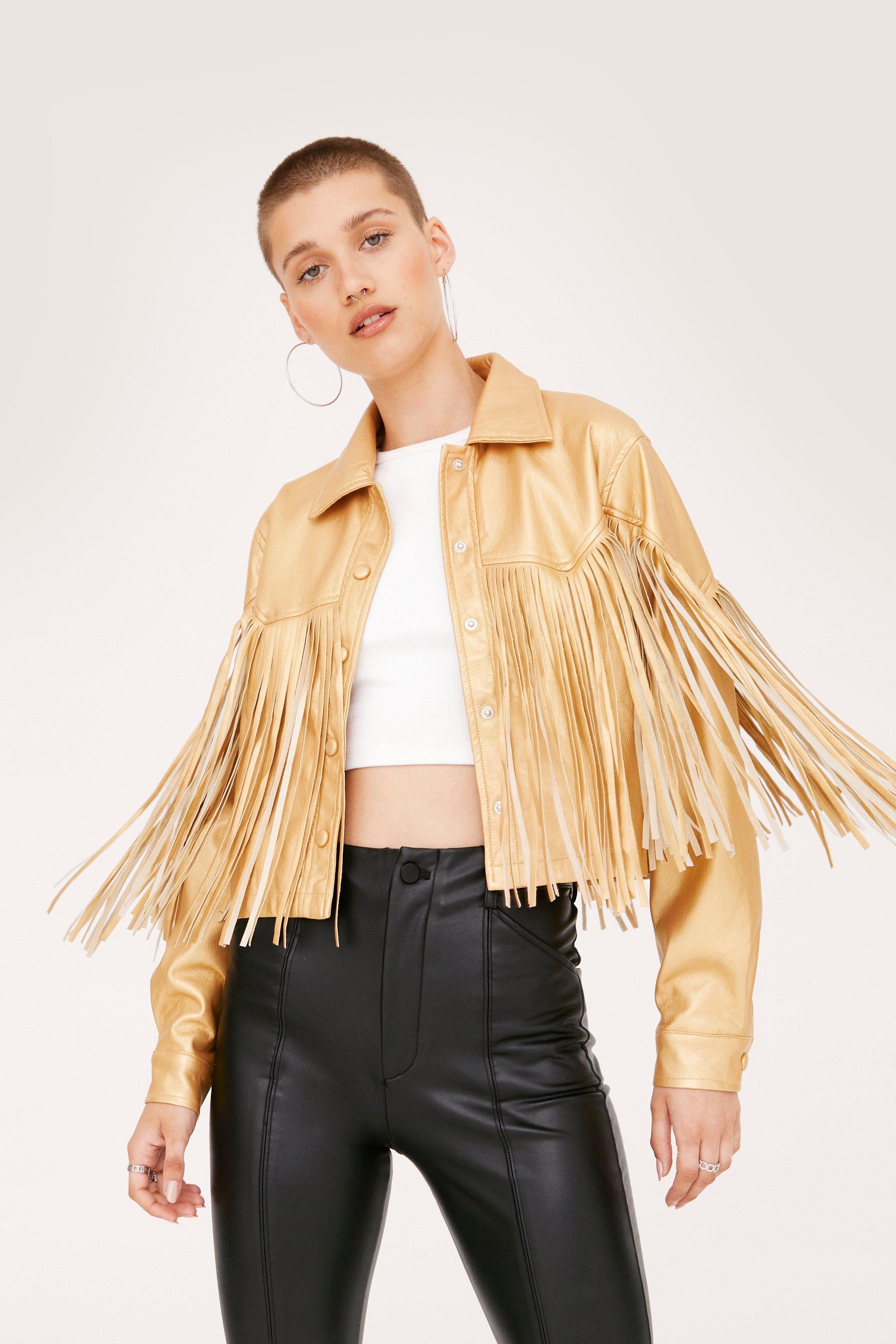 Gold fringe jacket clearance, Nasty Gal Faux Leather Fringed Western clearance