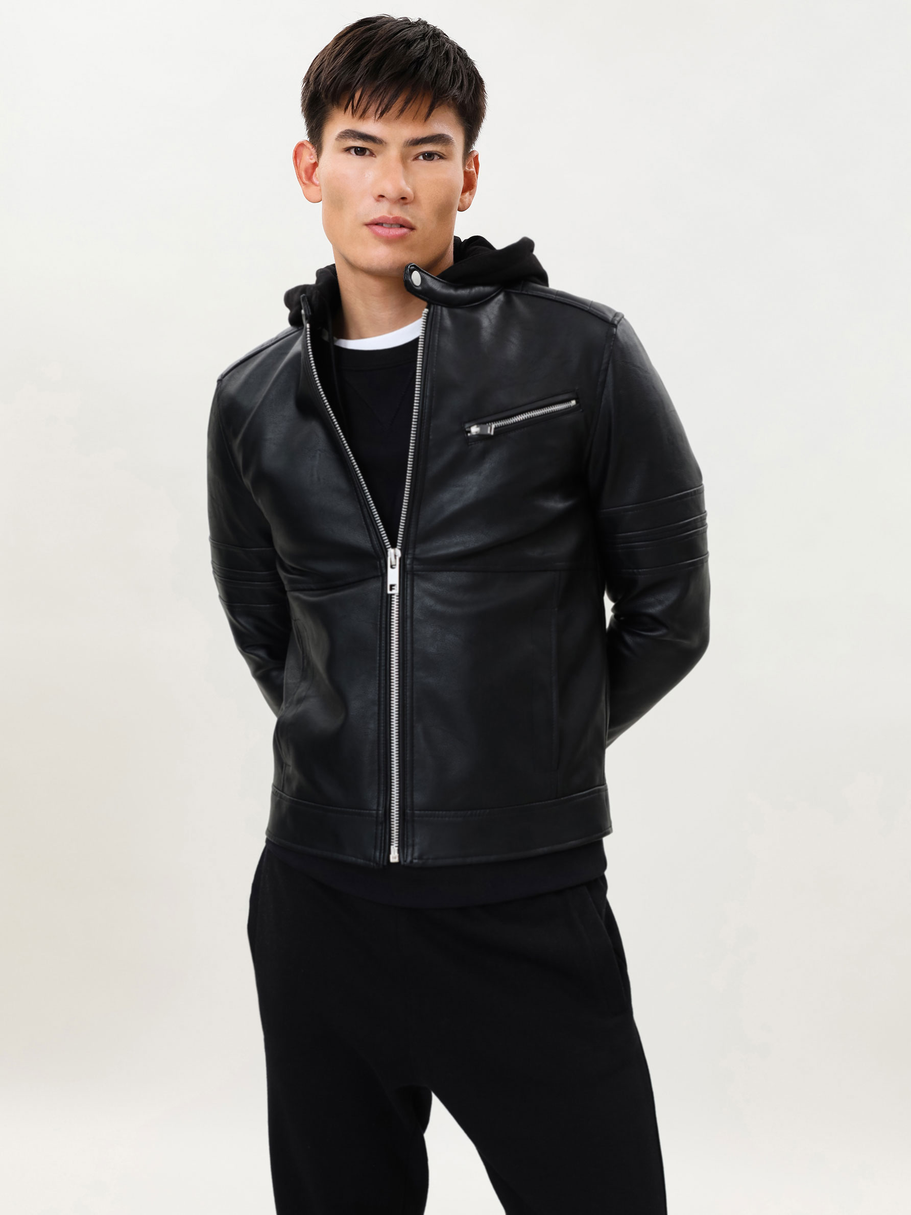 - Faux hooded leather jacket