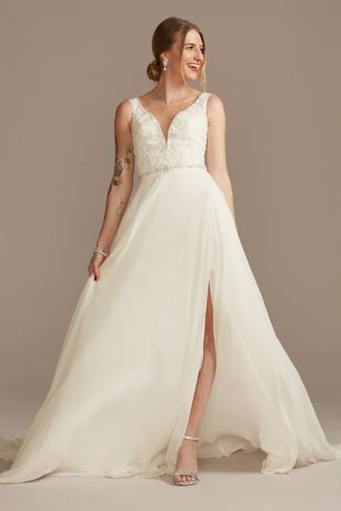 Wedding dress chiffon skirt clearance, Lace Applique Plunge Chiffon Skirt clearance