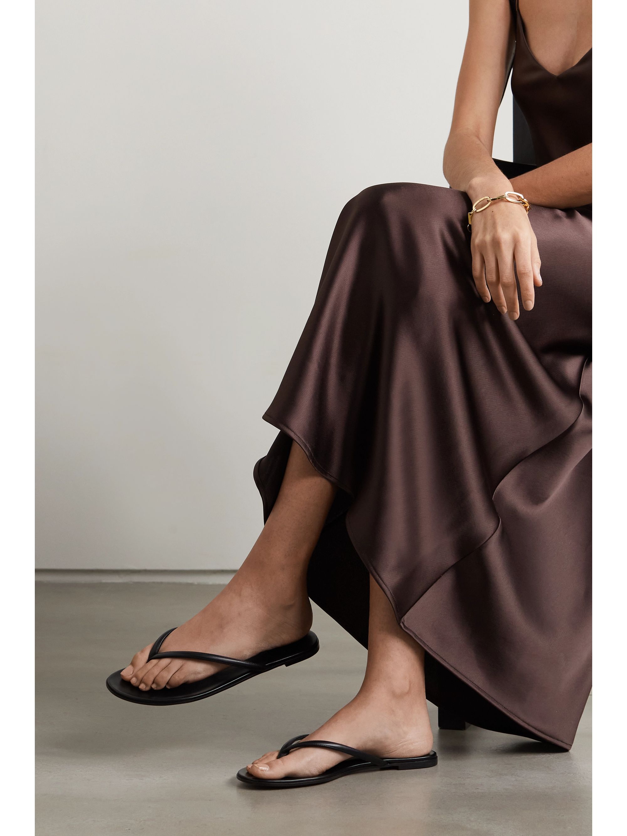 - Black leather flip flops