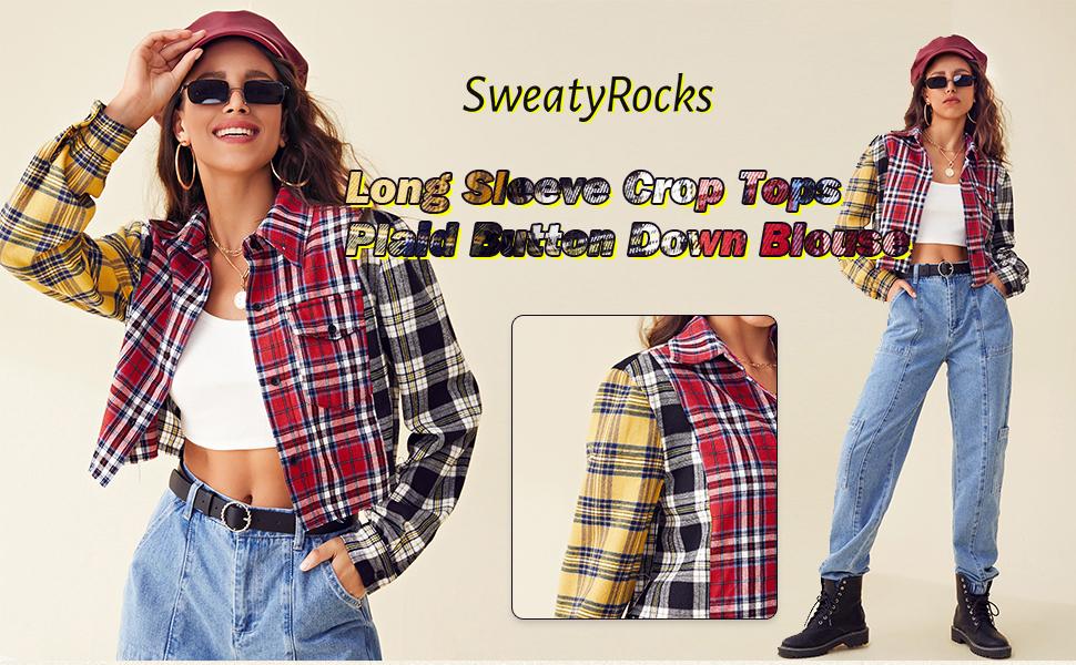 Flannel and crop top outfits clearance, Long Sleeve Crop Tops Plaid Button Down clearance