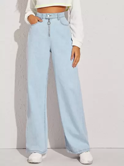Light wash baggy jeans shein clearance, Light Wash High-Waisted O-ring Baggy clearance