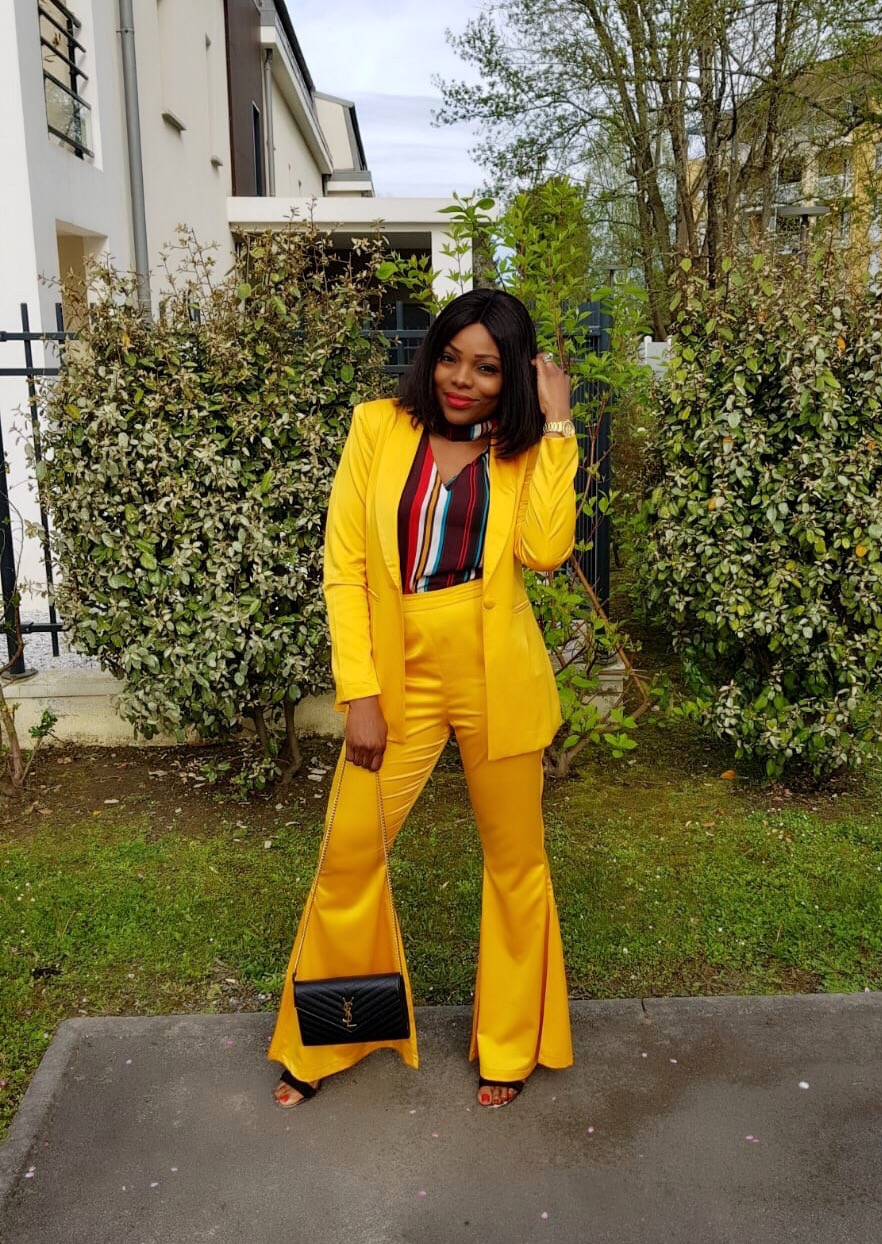 - Blazer and flare pants