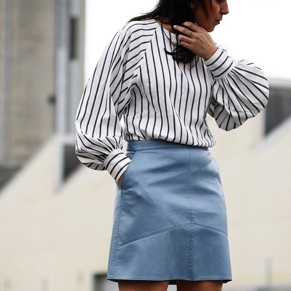 - Blue faux leather skirt