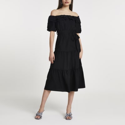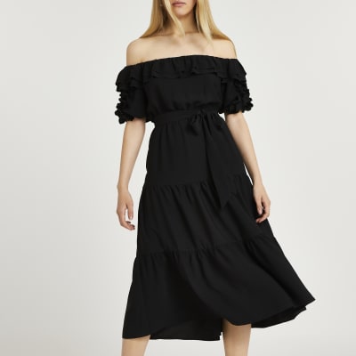 River island black bardot dress clearance, Black bardot frill midi dress | River clearance
