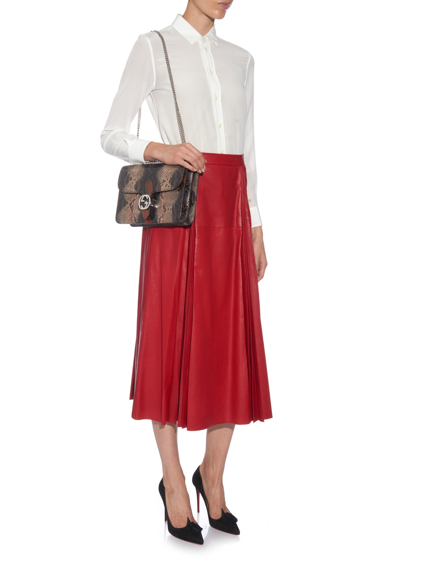 - Red leather pleated skirt