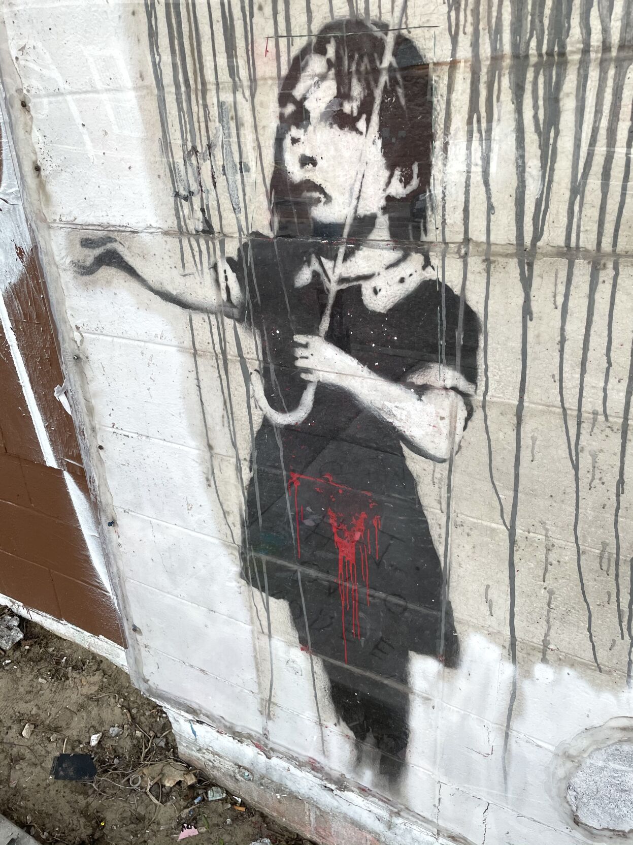 Niña paraguas banksy clearance, Vandalized Banksy graffiti painting in clearance